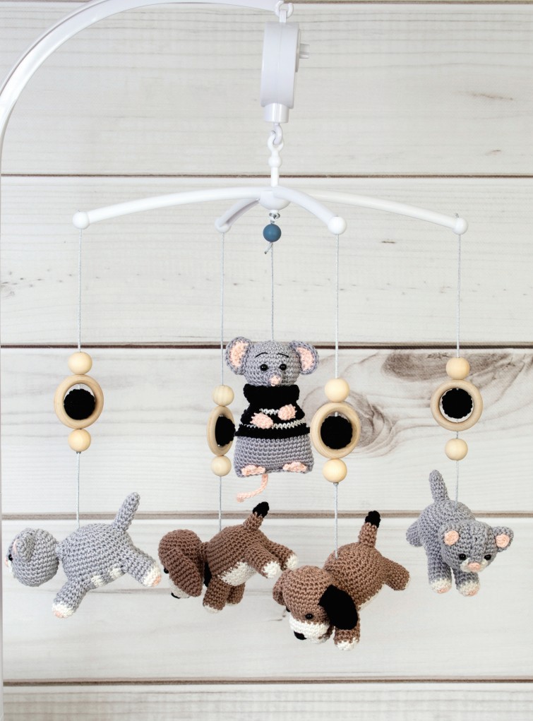 Haakpatroon muziekmobiel hondjes, muisje en poesje